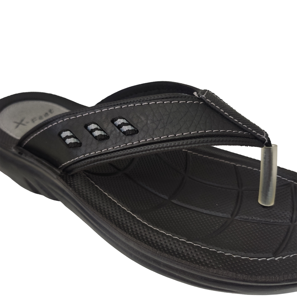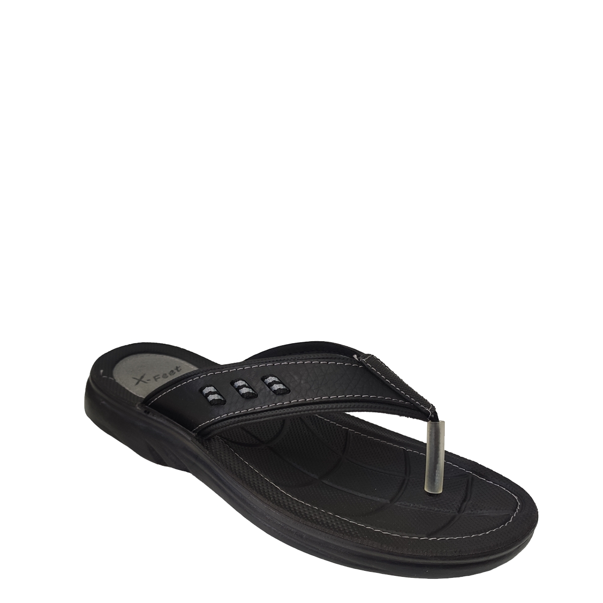 Ανδρική καλοκαιρινή δίχαλη παντόφλα X-FEET σε μαύρο χρώμα Ελληνικής Κατασκευής με συνθετικό δέρμα το πάνω μέρος με δερμάτινο πάτο. Ανατομικού σχεδιασμού σόλα και φτιαγμένη από καουτσούκ για μεγαλύτερη ευλυγισία και άνεση στο περπάτημα. Ιδανική παντόφλα για τις καλοκαιρινές εξορμήσεις, την παραλία αλλά και για τις εξόδους σας.